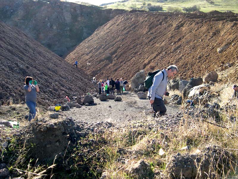 28 Noviembre 2015 Excusión de mineralogía a los volcanes del Campo de Calatrava Nos reunimos a la hora prevista en la gasolinera a las afueras de Ciudad Real, tras lo que nos trasladamos a la cantera Arzollar. Allí cargamos con nuestras herramientas y nos dirigimos a la escombrera, o lo que queda de ella, puesto que las máquinas han estado trabajando. Aún así queda mucho material, en el que se veían numerosas calcitas. Cuando hubimos recogido las piezas que nos parecieron suficientes, de vuelta a los coches, puesto que en la zona cercana al aparcamiento es donde se encuentran las zeolitas ( philipsita, tobermolita y natrolita.). Las piedras no eran pequeñas, Yyeran bastante duras, pero trabajamos duro y obtuvimos buenas piezas. Así llegamos a la hora de comer, cosa que hicimos en la cantera, tras lo que nos trasladamos al volcán de Posadilla. Subimos por el camino indicado y llegamos a la cima para ver que la laguna se ha secado por la falta de lluvias, pero el paisaje es muy bonito. Descenso hasta los coches y despedida hasta la próxima.