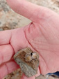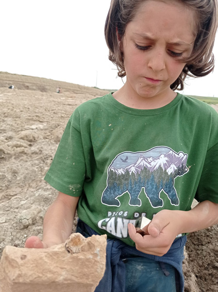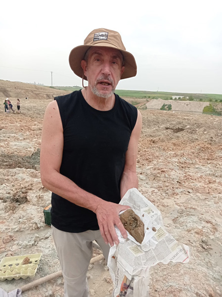 Al llegar a la finca, Aitor nos fue aconsejando las zonas dónde podía intuirse el mineral. Había dos localizaciones que por así decirlo podrían contener el “filón” de lo que buscábamos. A ras de suelo en la zona de la llanura, o en el propio corte de la montaña de la explotación. Para este segundo punto, debíamos buscar las franjas de distintos colores que delimitaban las capas de sedimentación de materiales. Si separábamos material por encima de la franja de color teja y entre medias del color grisáceo la formación de geodas tenía posibilidad de ser más abundante. Sólo quedaba tener “suerte” y que la geoda no estuviera hueca, si no que contuviese … Eureka! un aragonito acicular.