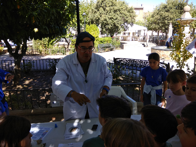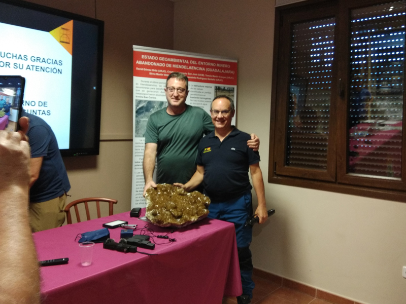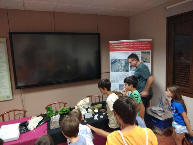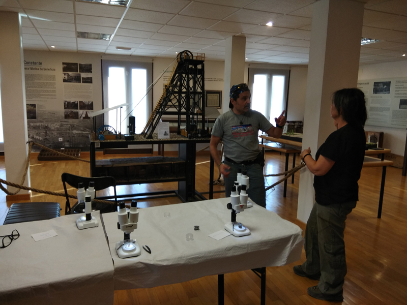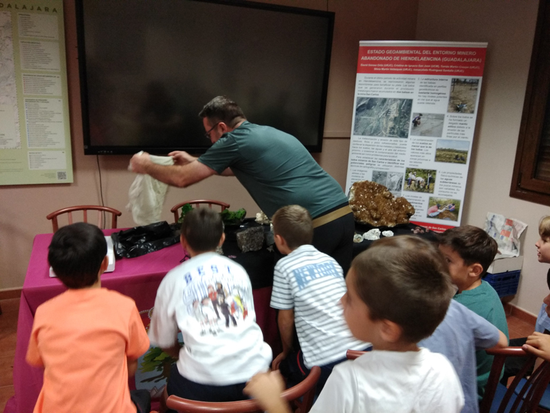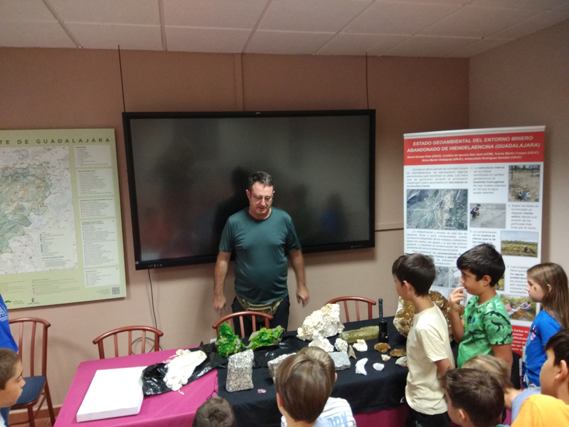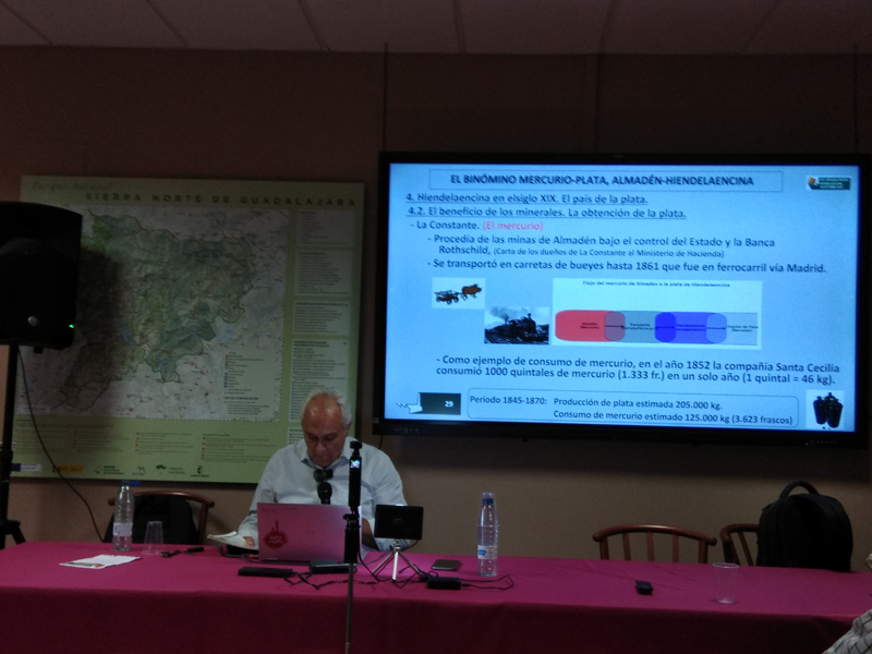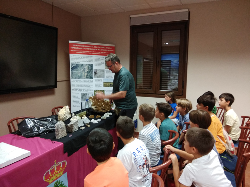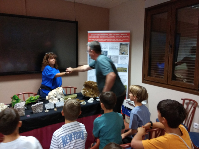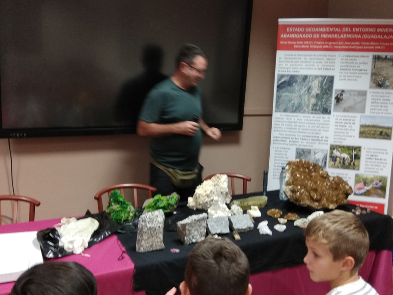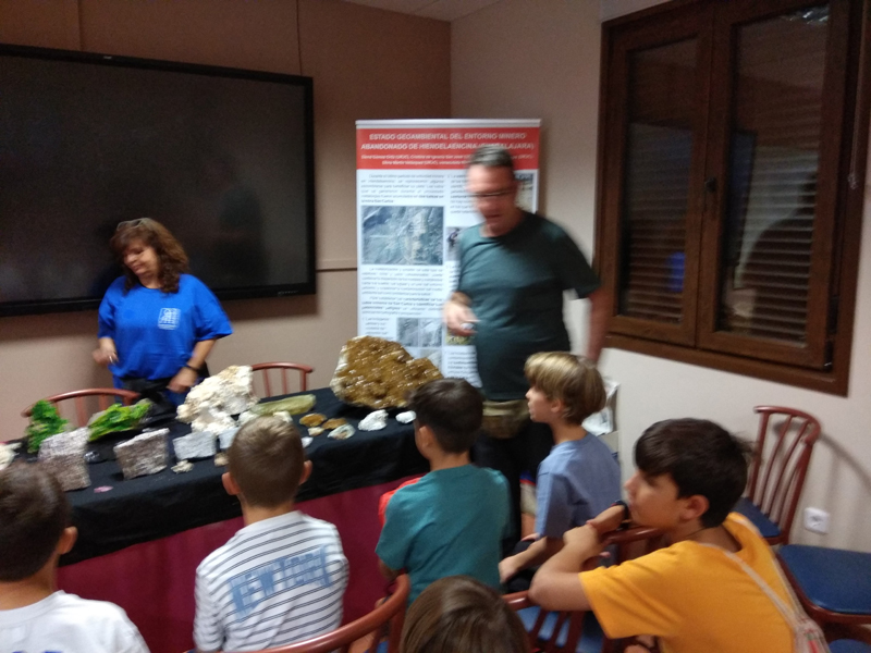 La participación del Grupo Mineralogista en las actividades mineras de la jornada como todos los años. El Presidente del Grupo Mineralogista de Madrid, D. Luis Jordá, Doña Ana López Gemóloga, Doña Almudena Carrero y Don Rafael Jordá, geólogos, realizaron varios talleres mineralógicos, de bateo, actividades y gymkana. D. Antonino Bueno, Mineralogista, preparó una actividad sobre fluorescencia y fosforescencia mineral. Todo ello con gran afluencia de público y participación, disfrutando de las visitas guiadas, exposiciones preparadas y comida en la Plaza. Finalizada la charla de la tarde, “El binomio Mercurio-Plata, Almadén-Hiendelaencia”por D. Luis Mansilla, grabada por D. Gonzalo García para Frente Minero y la presentación de los avances en los trabajos de musealización de la mina Santa Catalina, el País de la Plata, por D. Javier Roldán.